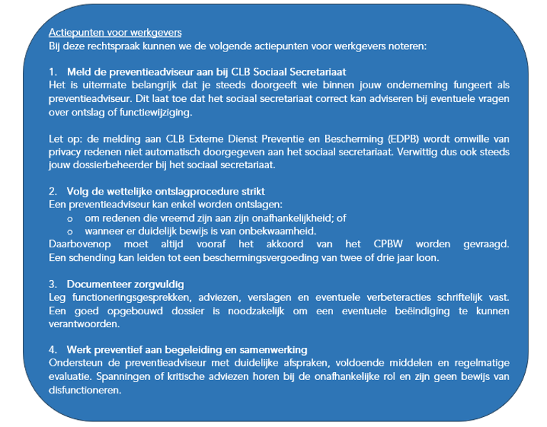 Met andere woorden: de werkgever mag een preventieadviseur niet ontslaan omdat diens adviezen kritisch zijn of omdat zijn optreden ongemak veroorzaakt binnen de organisatie. Alleen wanneer duidelijk kan worden aangetoond dat de persoon zijn functie niet naar behoren uitoefent, of dat het ontslag volledig losstaat van zijn preventieve rol, kan een beëindiging gerechtvaardigd zijn.