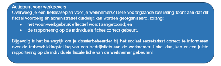 De bedragen van de fietsvergoeding en/of het voordeel van de bedrijfsfiets moeten vermeld worden op de fiscale fiches van de betrokken werknemers (fiches 281.xx). Deze rapportering moet gebeuren op het ogenblik van de terbeschikkingstelling van de fiets. De fiscus moet immers een beoordeling maken op het ogenblik dat de begunstigde over het voordeel kan beschikken. De fiscus zal bij de aangifte vervolgens nagaan of de werknemer kiest voor forfaitaire beroepskosten (waarbij de vrijstelling geldt) of voor werkelijke kosten (waarbij de vrijstelling niet kan worden toegepast).